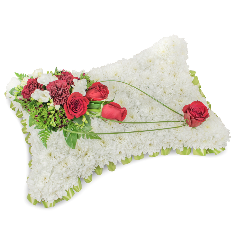 Convey your heartfelt condolences with our graceful sympathy flower arrangement. This elegant bouquet features a beautiful mix of white chrysanthemums, red roses, white freesias, and dark red carnations, elegantly complemented by dianthus and bear grass for a unique and touching presentation.